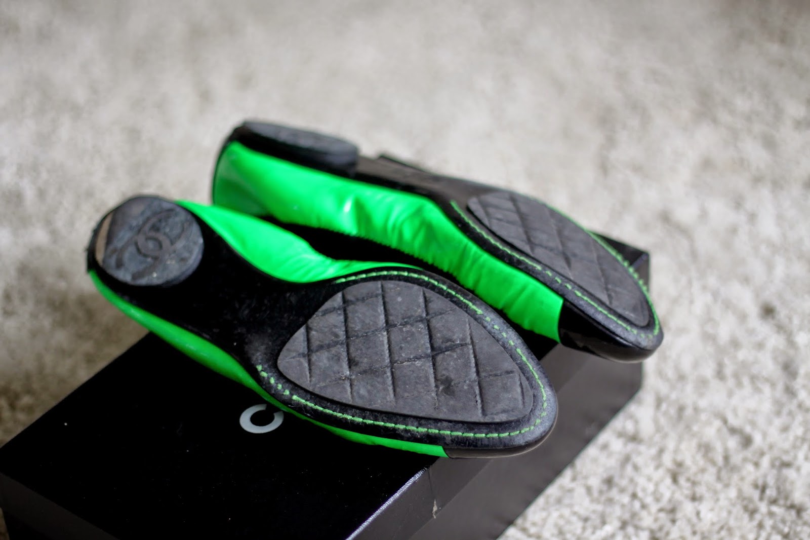 I mean, how cool are these stunners from Chanel, limited edition colours in neon green. On me here. And here. I bought the last pair they had, a half size too big and have never really been able to wear them properly since they've always a little bit too big. So these can be yours. Amazing to a pair of jeans to the perfect poppy effect. Comes with Chanel shoe box! They need to be taken to the shoe maker for and get an new heel sole, but that cost 10Euro to fix. Take them to the shoe maker when needed and you can wear them all your life. Comfy as slippers, incredible!